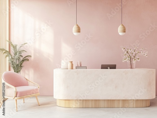 pink, reception, area, design, minimalist, modern, decor, chair, wooden, light, lamp, desk, counter, table, stone, pastel, office, waiting, room, interior, style, elegant, sophisticated, aesthetic, calm, serene, tranquil, peaceful, flower, vase, plant, blossom, spring, neutral, beige, reddening, wood, concrete, contemporary, clean, simple, bright, space