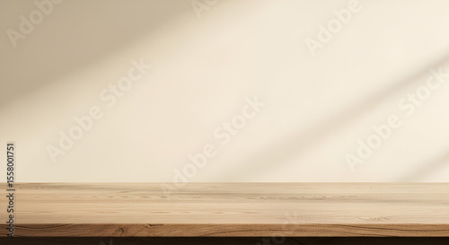 Minimalist product display background featuring an empty wooden table and natural light casting soft shadows on a warm beige wall.