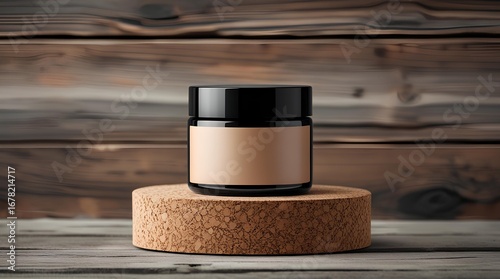 Minimalist product mockup of a dark glass cosmetic jar with black lid and blank brown label