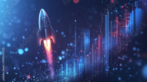 Minimalist rocket launching beside ascending bar graphs, blue background, concept of business growth and success, startup progress, clean and modern style