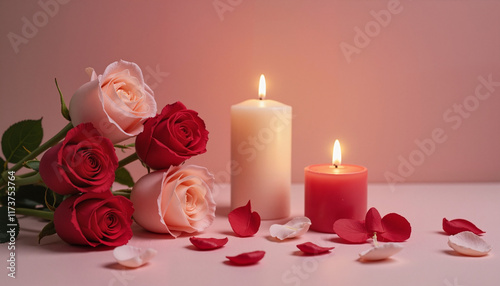 february 14, rose, candle, love, romance, floral, decoration, minimalism, celebration, intimacy, red, pink, white, flower petals, light, calmness, beauty, aesthetic, arrangement, emotion, softness, warmth, serene, composition, elegance, indoor, cosy, human relationships, gift, occasion, atmosphere, sweet, no people, 2, romantic, festive, charming, delightful, evening, simplicity, tenderness, peaceful, ambience, artistic