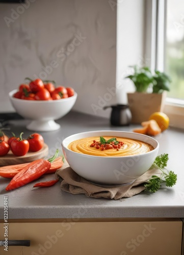 Minimalist setup with a white bowl of roasted red pepper hummus in a modern kitchen, minimalist decor, healthy eating