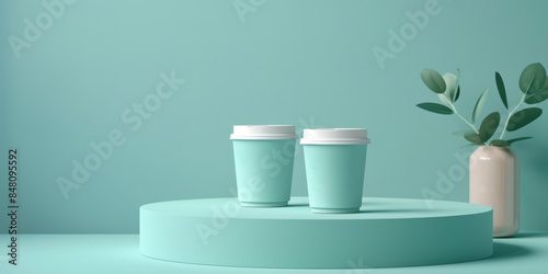Minimalist setup with coffee cups and eucalyptus leaves on a pastel background, highlighting simplicity and elegance in design.