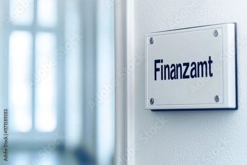 Minimalist sign indicating Finanzamt on a bright white wall in a modern office setting