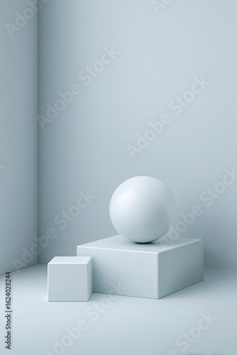 white, sphere, cube, shape, form, minimal, still, life, scene, modern, abstract, art, design, studio, indoor, angle, surface, shadow, light, soft, clean, simple, space, plain, geometry, block, smooth, matte, shape, wall, corner, bright, pastel, tone, muted, clear, pure, stack, stacked, display, empty, calm, serene, quiet, depth, render