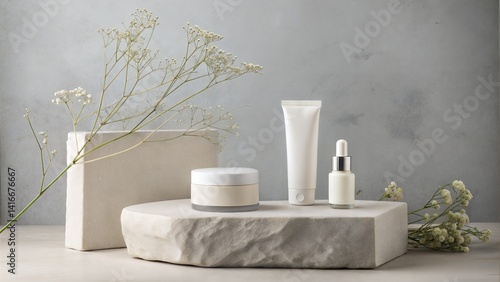 stone, dais, beauty, product, display, minimalist, grey, background, presentation, style, interior, clean, modern, luxury, furniture, design, home, decor, studio, concept, tabletop, cosmetic, skincare, white, shelf, footed, smooth, elegant, geometric, architecture, light, indoor, simple, natural