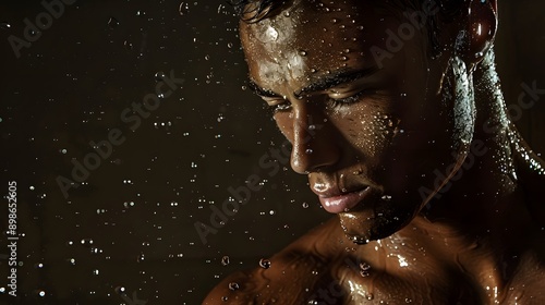 Minimalist studio portrait of a world-class swimmer, with water droplets glistening on chiseled features under soft lighting.