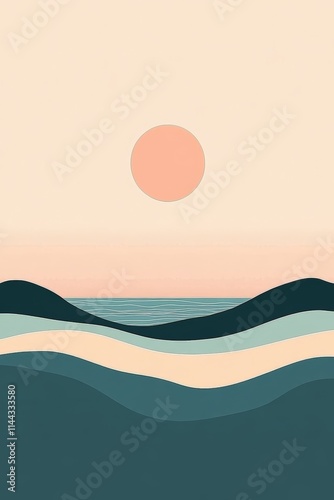 sunset, sea, wave, horizon, landscape, minimalist, pastel, abstract, nature, illustration, digital artwork, calmness, shoreline, gradient, calm, evening, artistic, warm tones, coastal, peaceful, scenery, water, silhouette, modern, serene, graphic design, earth-tone, sky, light, ocean, simplicity, curve, relaxation, beauty, design, warm colors, atmospheric, aesthetic, summer, ambient