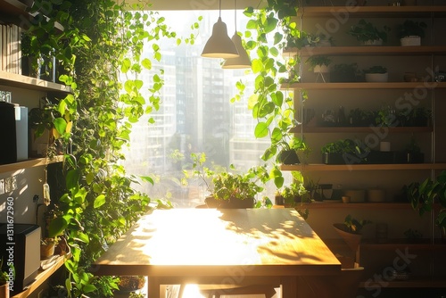 Minimalist urban jungle apartment featuring cascading greenery for a serene, modern living space.