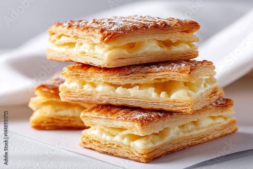 Minimalist view of rectangular puff pastry layers filled with creamy filling. Bright kitchen setting on a clean white surface. Concept of baking, desserts, pastry shops