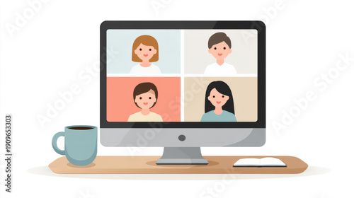 minimalist, virtual, meeting, computer, monitor, diverse, participant, illustration, flat, design, online, communication, remote, work, digital, technology, workspace, office, desk, hot drink, cup, notebook, chat, video, call, screen, colours, simplicity, modern, style, minimal, cyberspace, face, icon, interaction, home, business, collaboration, network, graphic, art, creativity, education, telecommute, lifestyle