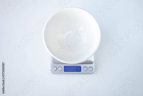 minimalist weight measurement, porcelain bowl on digital scale, precise kitchen measurement displayed