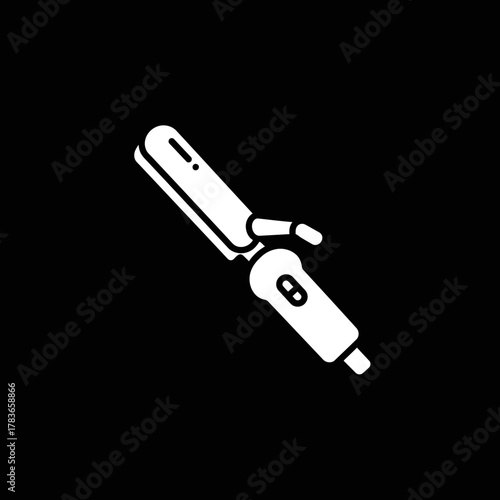 Minimalist White Glyph Icon of a Hair Curling Iron on a Solid Black Background