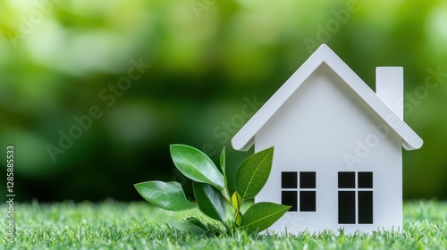 Minimalist White House Model Surrounded by Green Leaves on Blurred Nature Background for Real Estate Concept