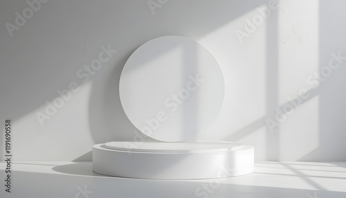 dais, display, background, white, circle, round, platform, stage, racked, presentation, product, showcase, design, scene, minimal, modern, clean, simple, empty, blank, space, sunlight, shadow, light, room, interior, wall, window, texture, abstract, art, illustration, render, three-dimensional, graphic, style, elegance, template, concept