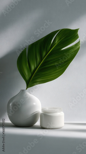 minimalist, white, vase, tropical, leaf, jar, design, eco, lux, green, plant, decor, interior, modern, clean, simple, elegant, natural, fresh, botanical, home, style, aesthetic, beauty, calm, serene, peaceful, bright, light, shadow, texture, smooth, ceramic, glasses, container, foliage, arrangement, artistic, contemporary, tranquil, organic, purity, harmony, balance