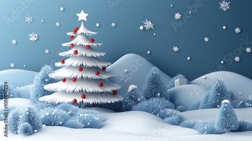 Minimalist winter scene with a white Christmas tree and snowflakes on a serene blue background