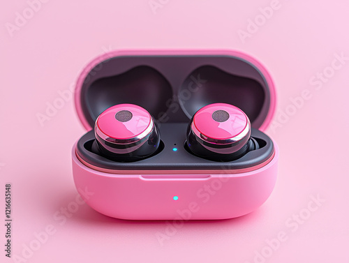 Minimalist wireless earbuds with charging case on a pastel pink background