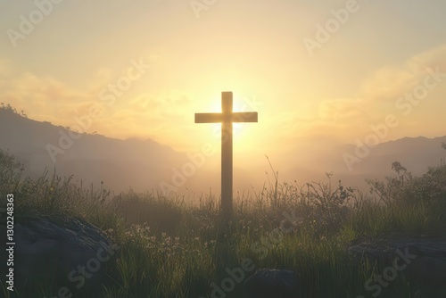minimalist wooden cross silhouetted against a sunrise over mountains, with gentle rays of light creating a halo effect through morning mist, symbolizing hope and spiritual renewal