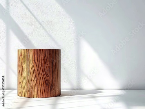 Minimalist wooden podium with beautiful wood grain in sunlight, casting shadows on a white wall, perfect for luxury cosmetic and skincare product displays.
