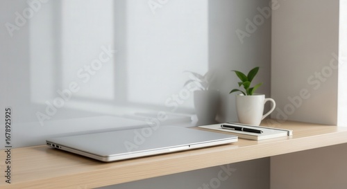 laptop, workspace, plant, notebook, pen, desk, minimalism, wood, natural, light, home, office, clean, modern, technology, green, white, container, writing, closed, calm, simple, shadow, window, surface, bright, indoor, table, object, business, concept, compact, elegant, still life, scene, furniture, space, stationery, work, minimalistic, arrangement, contemporary, room, cleanliness, organisation, productivity, design