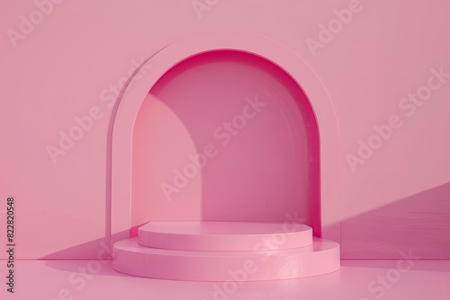 Minimalistic 3D podium with sleek design on matching pink background.