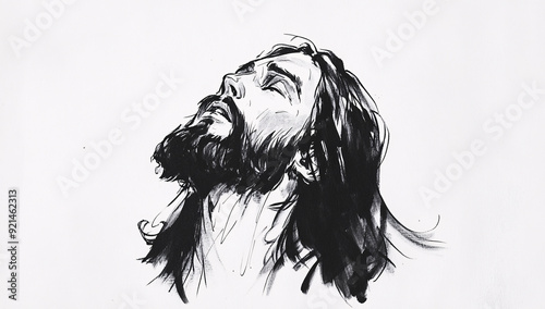 Minimalistic black and white ink drawing of Jesus Christ