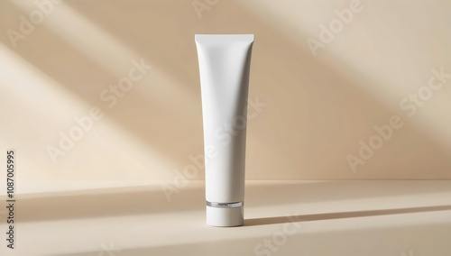 cosmetic, skincare, product, container, tube, white, cylindrical, minimalistic, modern, sleek, design, silver, band, cardboard box, lotion, cream, gel, smooth, surface, elegant, simplicity, sophisticated, minimalism, beauty, beige, background, lighting, shadow, contour, stylish, aesthetic, luxury, clean, chic, contemporary, branding, cosmetic, visual, display, photo, studio, retail, presentation, minimalist, blank, bottle, isolated, care