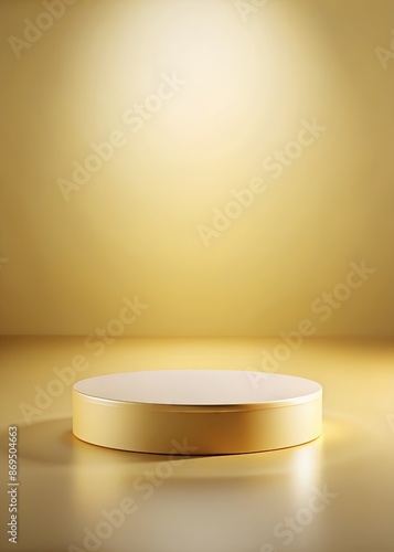 Minimalistic elegant display featuring a round golden pedestal podium with luxury spotlight on top, ideal for showcasing premium products.