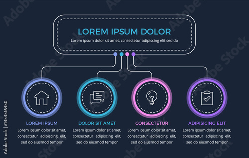 Minimalistic flow chart infographic template with 4 elements, dark background, vector eps10 illustration