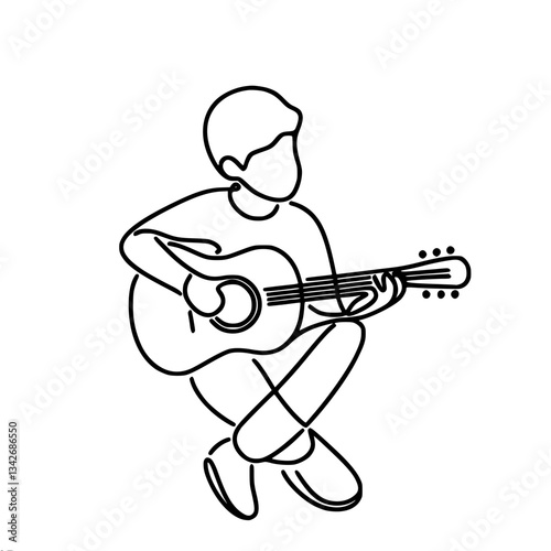 guitar, boy, little, children, to sit, play, sing, crossed, leg, music, minimalism, drawing, instrument, line, style, art, pose, black-and-white, outline, figure, player, sound, note, game, silhouette, vector, person