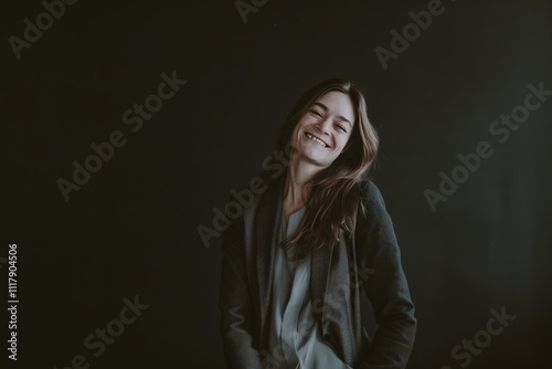 minimalistic portrait of smiling white female executive in her thirties, business casual clothes in dark colors, isolated on black, analogue film stock, analogue camera