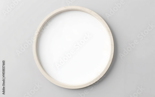 Minimalistic round mirror with a wooden frame on a light gray surface