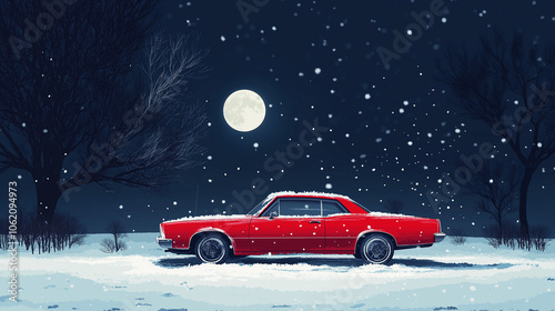 Minimalistic vintage car in snow on a solitary winter road with trees and full moon backdrop, a nostalgic winter landscape for holiday or seasonal design concepts