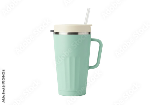Mint green insulated travel mug with handle and straw isolated, reusable drink container for hot and cold beverages