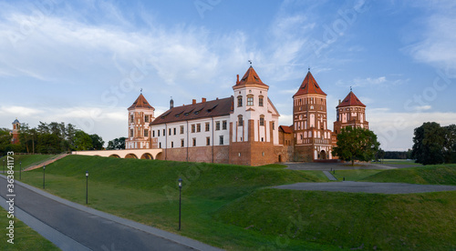 Mir Castle. Castle from a height at sunset. The village of Mir. Korelichi district. The Grodno region. Belarus.