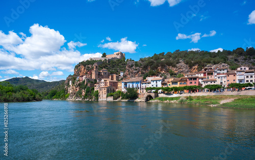 castle, travel, river, landscape, hill, tour tourism, village, town, tarragona, catalonia, spain, old, scenic, architecture, landmark, ancient, mediaeval, mediterranean, beautiful, ebro, europa, water, historic, mountain, nature, house, view, fortress, famous, coast, antique, sky