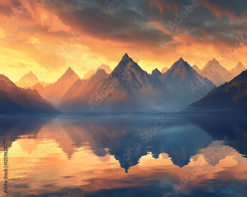 Mirrored Mountain Peaks Reflecting at Sunrise in Serene Lake
