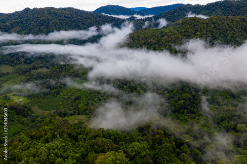 Mist and cloud forming over a dense, tropical rainforest in Thailand