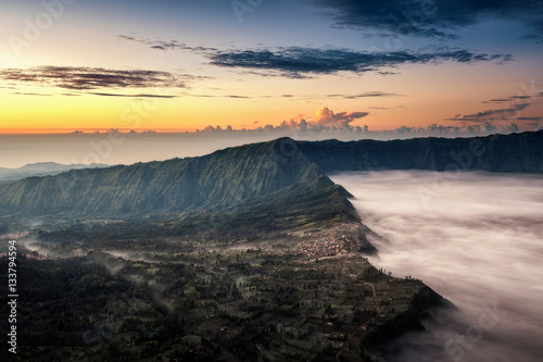 Mist flow through Cemoro Lawang Village with wonderful sky