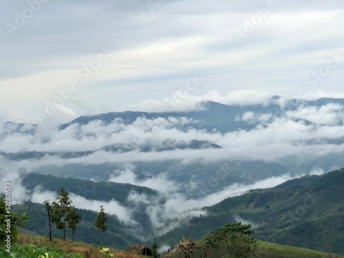 Mist in morning and green trees on mountain at Doi Chang, Chiang Rai, Thailand.