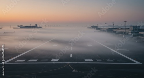 Misty Airport Runway at Dawn: Tranquil Waiting for Flight