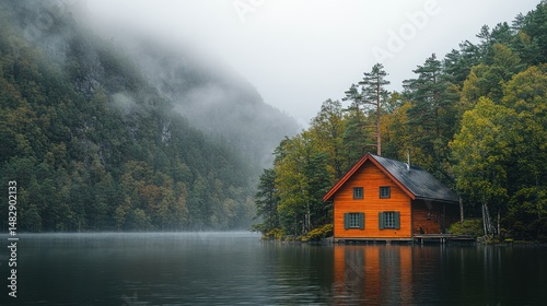 cabin, lake, autumn, misty, vale, house, forest, peaceful, nature, tranquil, scenic, mountain, wooden, foggy, calm, landscape, travel, vacation, adventure, get-away, relaxing, beauty, wood, hiking, photo, charming, cosy, inspiration, escape, serenity, relaxation, october, november, quiet, dreamy, alpine, water, exterior