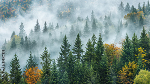 Misty autumn fir forest beautiful landscape serene and tranquil woods foggy and atmospheric fall scenery lush fir trees warm color palette peaceful and enchanting natural setting