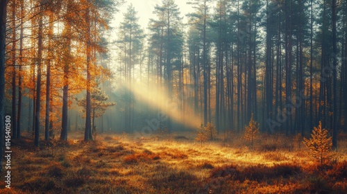 Misty autumn morning in serene forest nature tranquil environment dreamy viewpoint