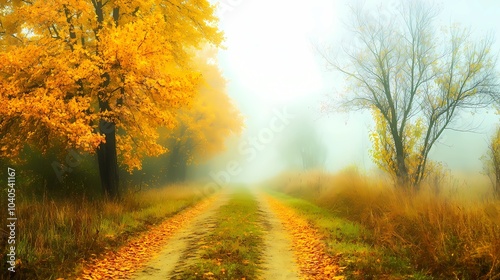 Misty autumn woodland, with colorful foliage and dense fog obscuring the background, perfect for tranquil and reflective nature-themed visuals.