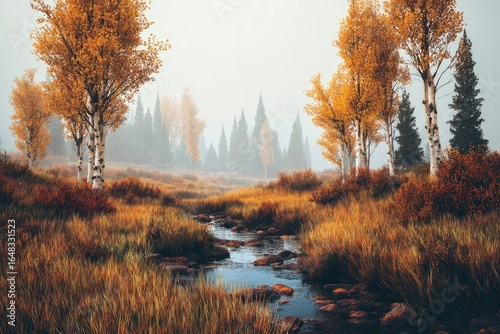 autumn, fog, misty, forest, tree, stream, creek, birch, fall, landscape, nature, gold, orange, yellow, brown, leaf, grass, plant, water, flowing, calm, tranquil, peaceful, scenic, autumn, image, digital, art, realistic, scenery, calmness, whimsical, serene, picturesque, rustic, foggy, colours, texture