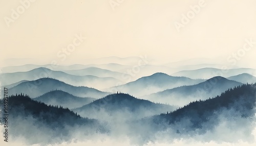 mountain, range, haze, mist, fog, blue, green, forest, tree, peak, summit, ridge, vale, landscape, nature, scenic, view, vista, atmosphere, serene, calm, peaceful, tranquil, art, painting, watercolor, abstract, minimalist, aethereal