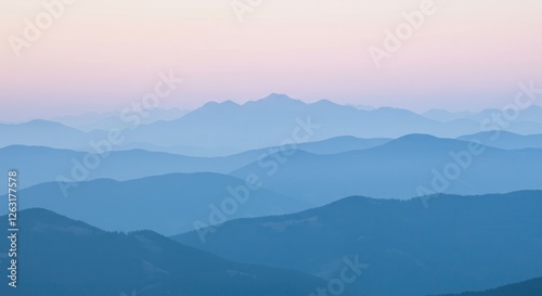 Misty Blue Mountain Range Landscape at Dusk with Soft Pink Sky