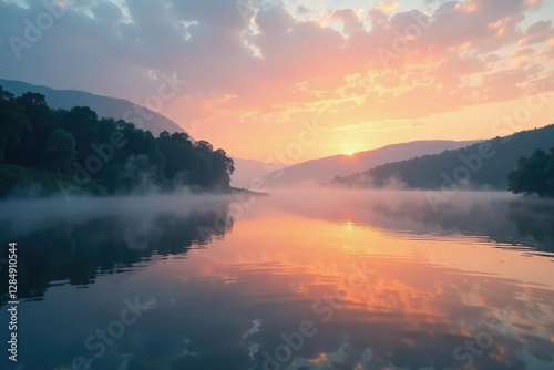 Misty dawn breaks over the river's tranquil surface, ripples, landscape, reflection